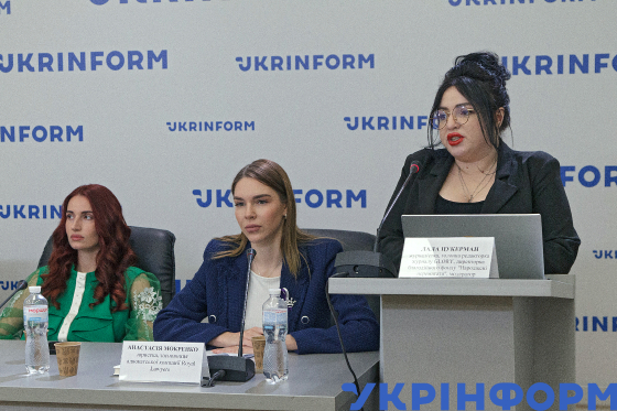 Модераторка, журналістка, головна редакторка журналу GLORY, директорка благодійного фонду "Народжені перемагати" Лала Цукерман, юристка, засновниця адвокатської компанії Royal Lawyers Анастасія Мокренко та українська захисниця з позивним Жанна дʼАрк, яка стала жертвою домашнього насильства, Євгенія Емеральд (справа наліво) під час презентації інформаційної акції "Говорити, щоб жити: боротьба з домашнім насильством", Київ, 8 листопада 2023 року.