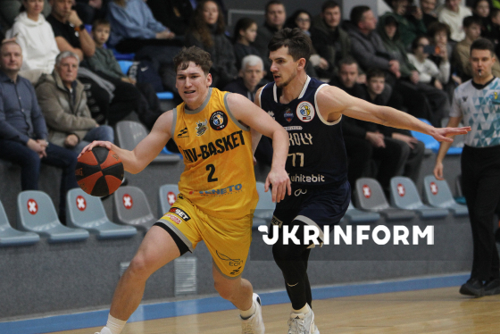 Гравці БК "Київ-Баскет" Єгор Сушкін (праворуч) та БК "Запоріжжя" Олександр Петренко беруть участь у матчі чемпіонату України з баскетболу серед команд Суперліги, що завершився поразкою господарів з рахунком 74:84, на майданчику КСК "Шинник", Дніпро, 28 березня 2026 року.