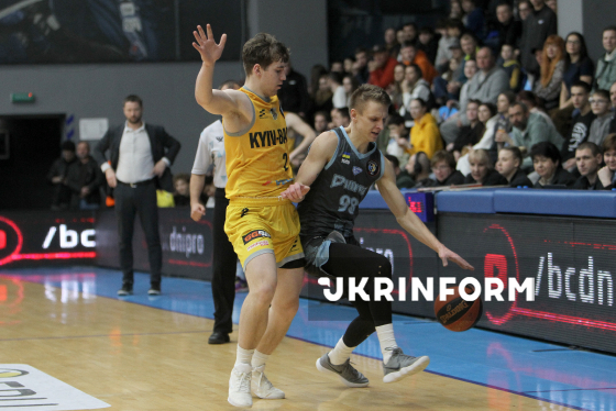 Гравці БК "Дніпро" Михайло Горобченко (праворуч) та БК "Київ-Баскет" Єгор Сушкін беруть участь у матчі чемпіонату України з баскетболу серед команд Суперліги, що завершився перемогою господарів з рахунком 100:51, на майданчику КСК "Шинник", Дніпро, 29 березня 2026 року.