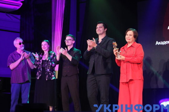 Члени команди Академічного музично-драматичного театру ім. Лесі Українки м. Кам’янського: режисер-постановник Віктор Попов, художниця Наталія Худіч, актори Іван Чебан, Ілля Каріков і художниця з костюмів Анжела Єрмоленко (зліва направо) під час отримання Гран-прі фестивалю за найкращу виставу "Хто я є?" у межах урочистої ювілейної церемонії нагородження переможців XXX фестивалю-конкурсу на найвищу театральну нагороду Придніпров’я "Січеславна-2025" у Дніпропетровській філармонії імені Л. Б. Когана, Дніпро, 30 червня 2025 року.