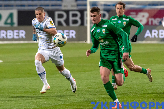 Гравці київського ФК "Динамо" Денис Попов (ліворуч) та львівського ФК "Карпати" Ігор Краснопір під час матчу 18-го туру чемпіонату України з футболу серед команд Премʼєр-ліги, що завершився перемогою господарів поля з рахунком 2:0, на стадіоні імені Валерія Лобановського, Київ, 23 лютого 2025 року.