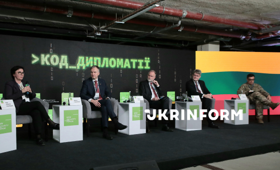 Надзвичайни і Повноважний Посол Литовської Республіки в Україні Інга Станітє-Толочкєнє, Надзвичайни і Повноважний Посол Республіки Латвія в Україні Андрейс Пілдеговічс, Надзвичайний і Повноважний Посол Швеції в Україні Мартін Оберг, Надзвичайни і Повноважний Посол Франції в Україні Гаель Весьєр і модератор, начальник відділу міжнародного військового співробітництва КС ТРО Тарас Березовець (зліва направо) беруть участь в 11-му Київському безпековому форумі для молоді "GEN W²: програмуй майбутнє", Київ, 5 грудня 2025 року.