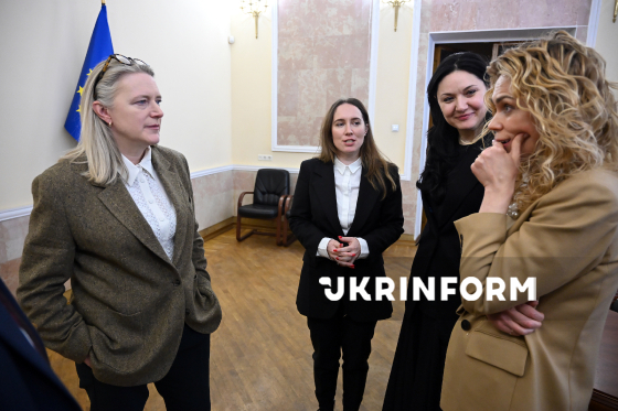 Віцепрем`єр-міністерка з гуманітарної політики України – міністерка культури України Тетяна Бережна (ліворуч), її заступниці Анастасія Бондар і Наталія Мовшович беруть участь у зустрічі з виконавчою віцепрезиденткою Mastercard по роботі з державним сектором Ейліш Кемпбелл, у межах якої Міністерство культури України та глобальна технологічна компанія Mastercard підписали меморандум про взаєморозуміння, Київ, 10 березня 2026 року.