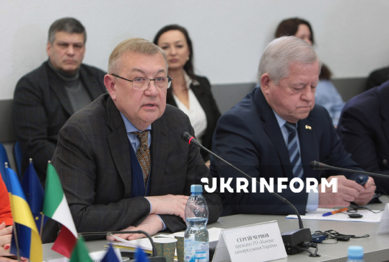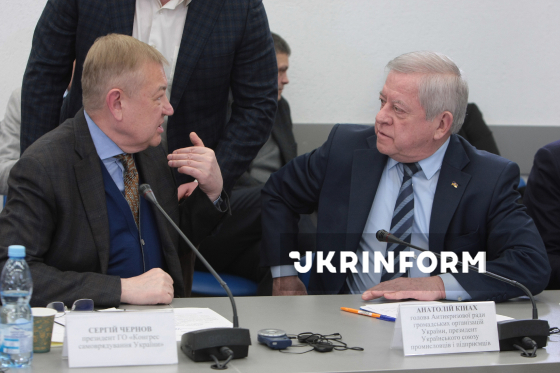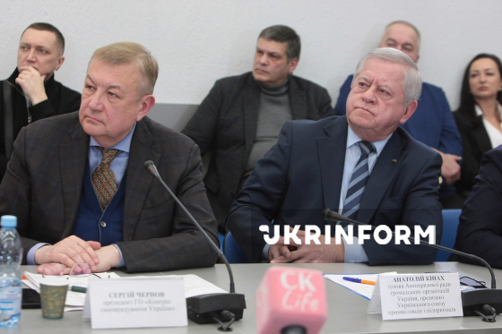 Президент Конгресу самоврядування України Сергій Чернов (ліворуч) та голова Антикризової ради громадських організацій України, президент Українського союзу промисловців і підприємців Анатолій Кінах беруть участь у міжнародній конференції на тему: "Сильне громадянське суспільство - шлях до побудови справедливого миру в Європі" в Українському національному інформаційному агентстві "Укрінформ", Київ, 23 лютого 2026 року.