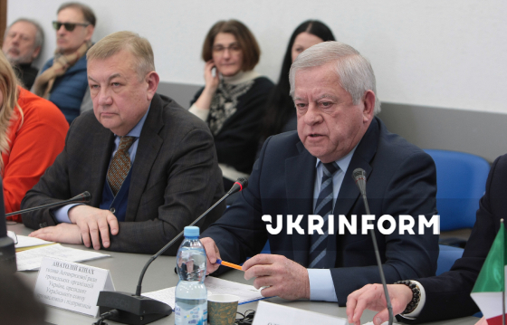 Прем’єр-міністр України 2001-2002рр., президент Українського союзу промисловців і підприємців (УСПП) Анатолій Кінах (ліворуч) і президент Академії будівництва України Іван Назаренко беруть участь у засіданні "круглого столу" на тему: "Імплементація EPBD в Україні. BIM-технології та nZEB. Бар’єри та здобутки", Київ, 27 жовтня 2025 року.