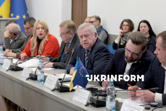Голова Антикризової ради громадських організацій України, президент Українського союзу промисловців і підприємців Анатолій Кінах (у центрі) виступає з промовою під час міжнароднлї конференції на тему: "Сильне громадянське суспільство - шлях до побудови справедливого миру в Європі" в Українському національному інформаційному агентстві "Укрінформ", Київ, 23 лютого 2026 року.
