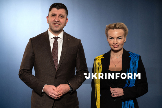 Голова Державної архівної служби України (Укрдержархів) Анатолій Хромов і журналістка Христя Равлюк позують для фото під час запису програми Укрінформу "ЄРозмова", Київ, 13 січня 2026 року.