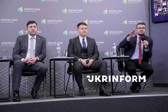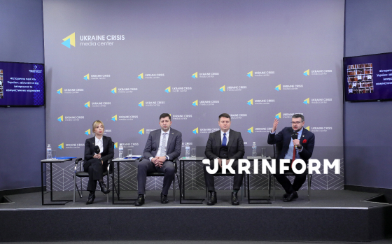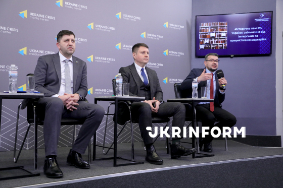 Голова Державної архівної служби України Анатолій Хромов, директор Департаменту державної реєстрації Міністерства юстиції України, голова Комісії з питань дотримання Законів України "Про засудження комуністичного та націонал-соціалістичного (нацистського) тоталітарних режимів в Україні та заборону пропаганди їхньої символіки" В’ячеслав Хардіков та голова Українського інституту національної пам’яті Олександр Алфьоров (зліва направо) беруть участь у пресбрифінгу на тему: "Історична пам’ять України: звільнення від імперських та комуністичних маркерів" в Українському кризовому медіа-центрі, Київ, 16 грудня 2025 року.