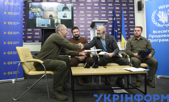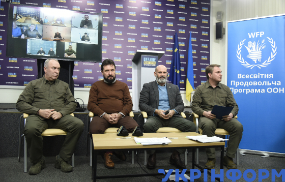 Очільник Черкаської обласної військової адміністрації Ігор Табурець, заступник міністра освіти і науки України Андрій Сташків, директор Всесвітньої продовольчої програми ООН в Україні Метью Голлінгворт, очільник Київської обласної військової адміністрації Руслан Кравченко (зліва направо) під час брифінгу “Підтримка шкільного харчування. Підписання договорів між очільниками 11 областей та Всесвітньою продовольчою програмою ООН в Україні”, Київ, 16 листопада 2023 року.
