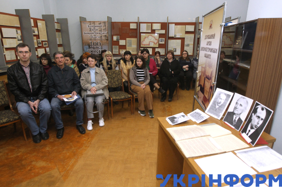 Учасники відкриття виставки оригінальних документів "Боротьба на два фронти. Діяльність ОУН на Дніпропетровщині під час Другої світової війни" Тетяна Зінковська під час її відкриття у Державному архіві Дніпропетровської області, Дніпро, 16 квітня 2025 року.