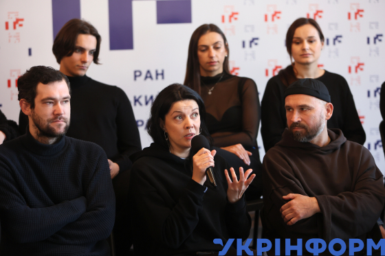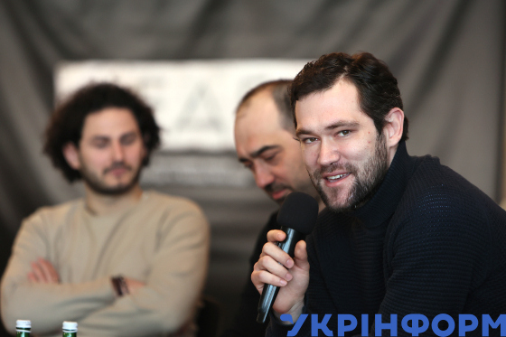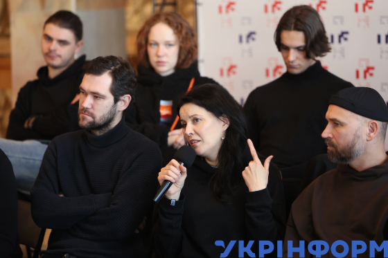 Актори Андрій Мельник, Надія Левченко, генеральний директор і художній керівник Івано-Франківського національного академічного драматичного театру ім. Івана Франка Ростислав Держипільський (зліва направо) під час зустрічі з акторами та режисером вистави “Медея” в Івано-Франківському національному академічному драматичному театрі ім. Івана Франка, Івано-Франківськ, 26 березня 2025 року.