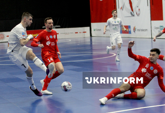 Гравці ФК "ХІТ" (Київ) Андрій Мельник, ФК "Athletic Futsal" (Дніпро) Ілля Терентьєв та Артем Щур (зліва направо) борються за м’яч під час матчу 1/4 фіналу Кубка України з футзалу, що завершився перемогою дніпровської команди з рахунком 4:3, Дніпро, 14 березня 2026 року.