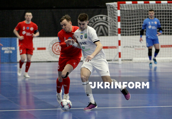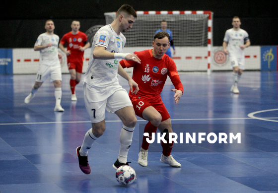 Гравці ФК "Athletic Futsal" (Дніпро) Давид Калашник (ліворуч) та ФК "ХІТ" (Київ) Андрій Мельник борються за м’яч під час матчу 1/4 фіналу Кубка України з футзалу, що завершився перемогою дніпровської команди з рахунком 4:3, Дніпро, 14 березня 2026 року.