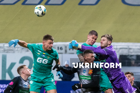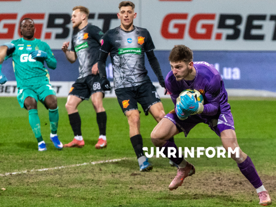 Воротар ФК "Інгулець" (Петрове, Кіровоградська область) Антон Жилкін (праворуч) бере участь у матчі 1/4 фіналу Кубка України-2025/26 з футболу проти київського ФК "Динамо", що завершився перемогою господарів з рахунком 2:0, на полі стадіону "Динамо" імені Валерія Лобановського, Київ, 3 березня 2026 року.
