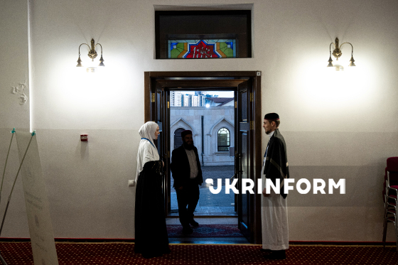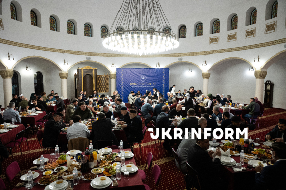 Мусульмани беруть участь в офіційному іфтарі - традиційній вечері з нагоди місяця Рамадан - у мечеті "Ар-Рахма", Київ, 5 березня 2026 року.