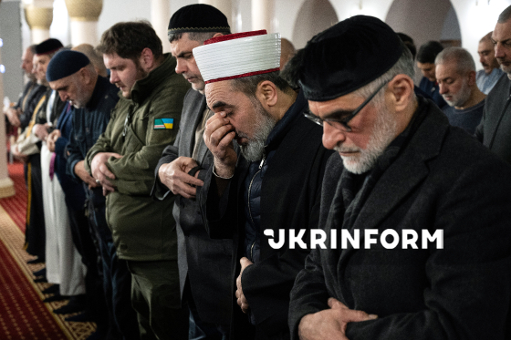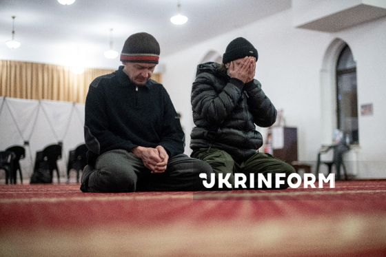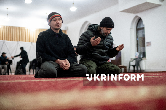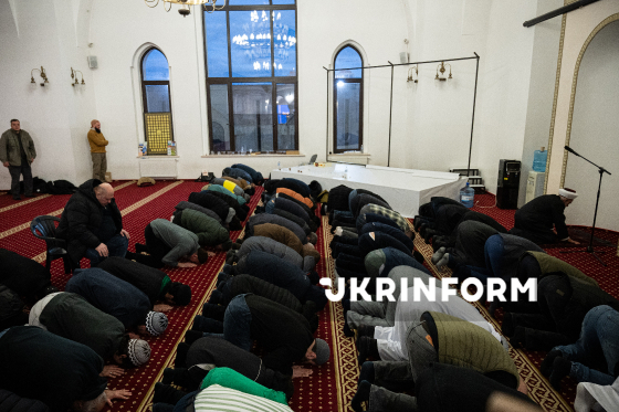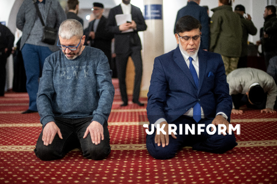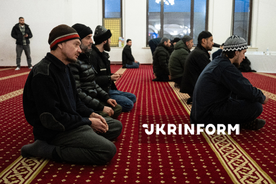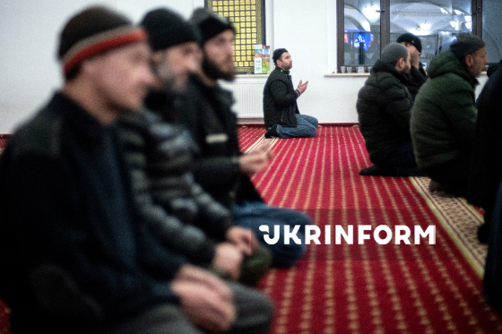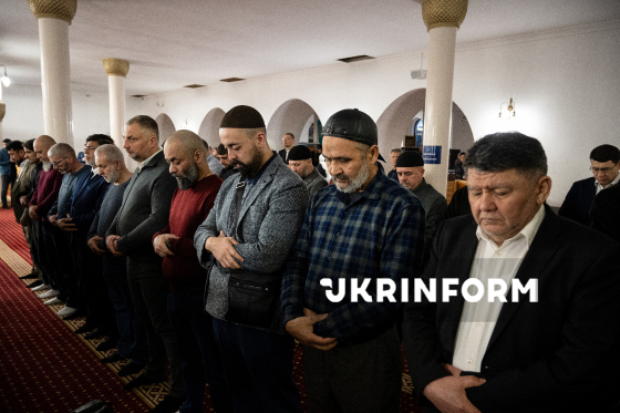 Мусульмани моляться перед початком офіційного іфтара - традиційної вечері з нагоди місяця Рамадан - у мечеті "Ар-Рахма", Київ, 5 березня 2026 року.