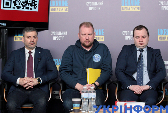 Уповноважений Верховної Ради України з прав людини Дмитро Лубінець, представник Координаційного штабу з питань поводження з військовополоненими Олег Гущин, радник Департаменту міжнародного права Міністерства закордонний справ України Богдан Чумак (зліва направо) під час пресконференції та презентації "Женевська Московська конвенція щодо поводження з військовополоненими", Київ, 20 листопада 2024 року.