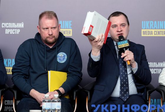 Представник Координаційного штабу з питань поводження з військовополоненими Олег Гущин (ліворуч) та радник Департаменту міжнародного права Міністерства закордонний справ України Богдан Чумак під час пресконференції та презентації "Женевська Московська конвенція щодо поводження з військовополоненими", Київ, 20 листопада 2024 року.