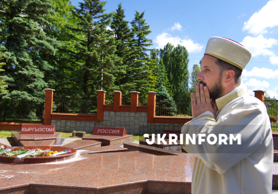 Мусульманський священнослужитель стоїть біля меморіалу жертвам депортації кримських татар 1944 року, яку Верховна Рада України 12 листопада 2015 року офіційно визнала геноцидом, ухваливши відповідну Постанову № 792-VIII, Сімферополь, АР Крим, 18 травня 2016 року. Фото Бориса Бобрикова.