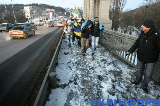 Учасники "живого ланцюга" під час акції "Стань поряд – об’єднай Україну" на столичному мосту Патона відзначають День Соборності України та 91-шу річницю проголошення Акта Злуки Української Народної Республіки (УНР) і Західноукраїнської Народної Республіки (ЗУНР), Київ, 22 січня 2010 року. Фото Вадима Григи.