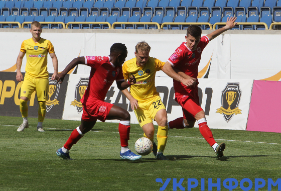 Гравці ФК "Верес" (Рівне) Денис Балан і СК "Дніпро 1" Валентин Рубчинський (у центрі зліва направо) у боротьбі за м’яч під час матчу 10-го туру української Прем’єр-ліги, що завершився перемогою господарів поля з рахунком 2:0, Дніпро, 7 жовтня 2023 року.