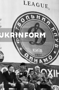 Президент Професійної футбольної ліги України (ПФЛ) Григорій Суркіс, головний тренер київського "Динамо" Валерій Лобановський та Прем’єр-міністр України Валерій Пустовойтенко (зліва направо) під час презентації команди – учасниці Ліги чемпіонів, що відбулась уперше в історії українського футболу на Майдані Незалежності, Київ, 20 вересня 1997 року. Фото Валерія Скиби.