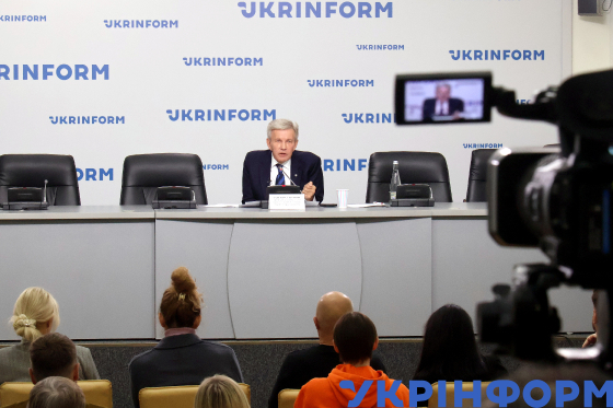 Президент Національного паралімпійського комітету України Валерій Сушкевич виступає з промовою під час пресконференції на тему: "Генеральна асамблея Міжнародного паралімпійського комітету в Сеулі: суттєві чинники ганебного рішення" в Українському національному інформаційному агентстві "Укрінформ", Київ, 2 жовтня 2025 року.