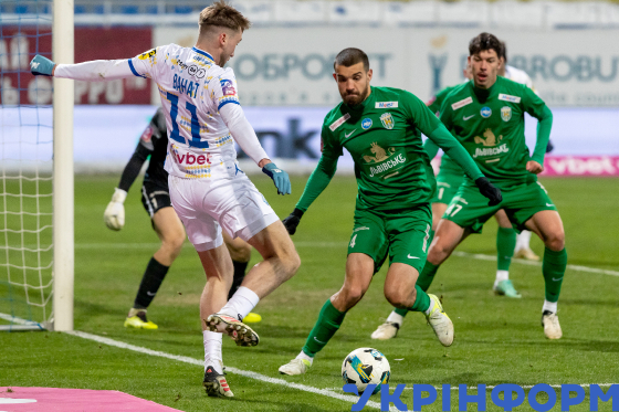 Гравці київського ФК "Динамо" Владислав Ванат та львівського ФК "Карпати" Владислав Бабогло (зліва направо) під час матчу 18-го туру чемпіонату України з футболу серед команд Премʼєр-ліги, що завершився перемогою господарів поля з рахунком 2:0, на стадіоні імені Валерія Лобановського, Київ, 23 лютого 2025 року.