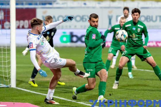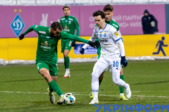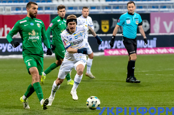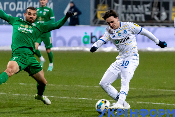 Гравці київського ФК "Динамо" Микола Шапаренко та львівського ФК "Карпати" Владислав Бабогло (справа наліво) під час матчу 18-го туру чемпіонату України з футболу серед команд Премʼєр-ліги, що завершився перемогою господарів поля з рахунком 2:0, на стадіоні імені Валерія Лобановського, Київ, 23 лютого 2025 року.