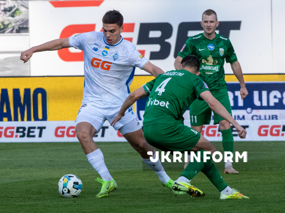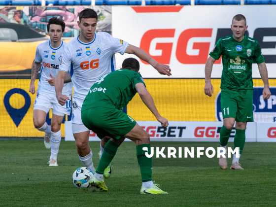 Нападник ФК “Динамо” Матвій Пономаренко (у центрі), захисник ФК "Карпати" Владислав Бабогло (праворуч) борються за м`яч під час матчу 22-туру чемпіонату України з футболу серед команд Прем`єр-ліги між ФК “Динамо” (Київ) і ФК “Карпати” (Львів), що завершився з рахунком 0:1 на користь львів`ян, на стадіоні “Динамо” імені Валерія Лобановського, Київ, 4 квітня 2026 року.
