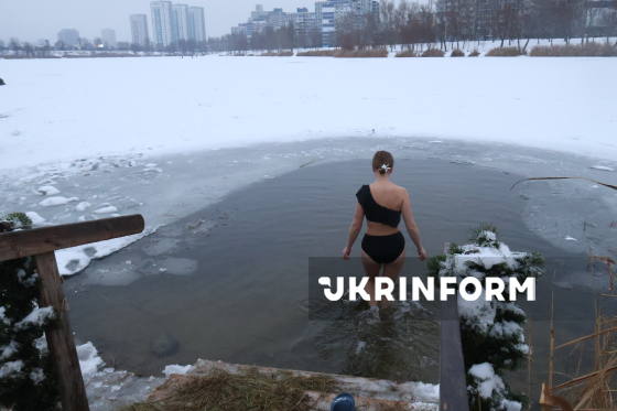 Дівчина заходить у воду під час святкування Водохреща в Йорданському озері, що в Оболонському районі міста, Київ, 6 січня 2026 року.