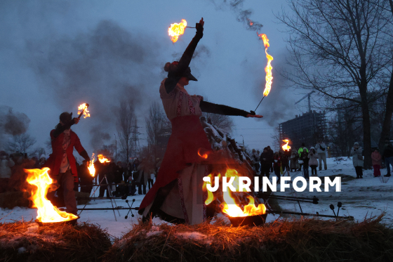 Артисти показують фаєр-шоу під час святкування Водохреща біля Йорданського озера, що в Оболонському районі міста, Київ, 6 січня 2026 року.