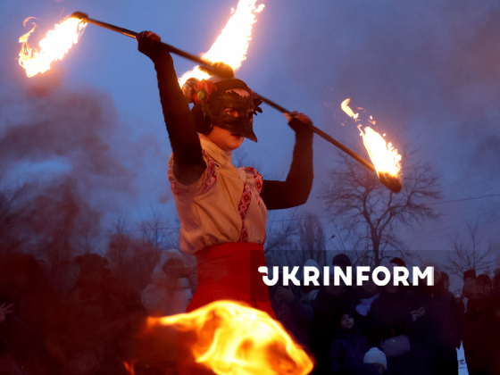 Артистка бере участь у фаєр-шоу під час святкування Водохреща біля Йорданського озера, що в Оболонському районі міста, Київ, 6 січня 2026 року.