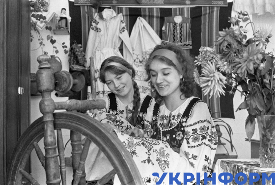 Відмінниці навчання Володимиро-Волинського педагогічного училища Тетяна Жук та Оксана Дацюк на заняттях народознавства, Волинська область, жовтень 1990 року. Фото Валерія Бєлова.