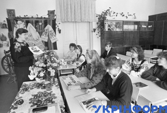 Учні Володимиро-Волинського педагогічного училища на заняттях народознавства, Волинська область, жовтень 1990 року. Фото Валерія Бєлова.