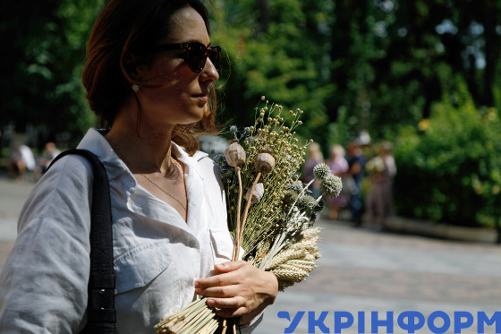 Жінка тримає букет-"маковійчик" під час освячення з нагоди відзначення за новим церковним календарем Медового Спасу, або ж Маковія, на площі біля Володимирського собору, Київ, 1 серпня 2024 року.