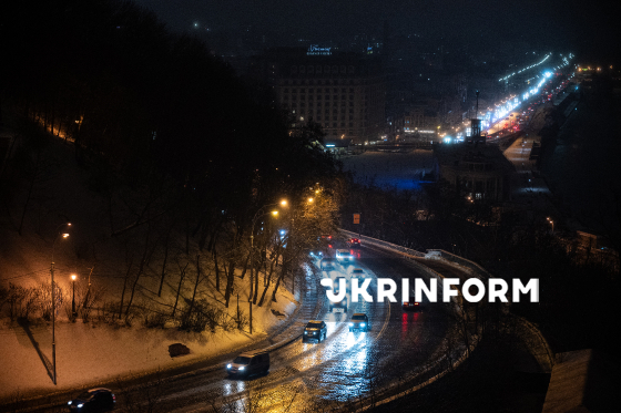 Автомобілі їдуть вечірнім Володимирським узвозом, Київ, 7 січня 2026 року.