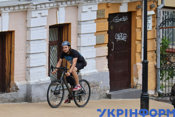 Чоловік їде на велосипеді Володимирським узвозом, Київ, 26 червня 2023 року.