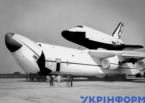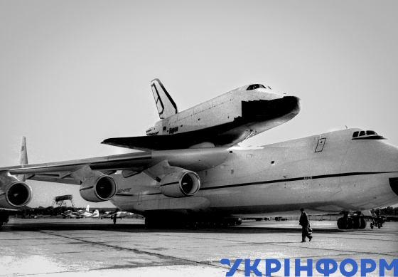 Український надважкий транспортний літак Ан-225 "Мрія" з космічним кораблем "Буран" на фюзеляжі після приземлення в аеропорту, Київ, 1989 рік. Фото Володимира Репіка.