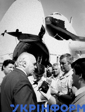 Заступник головного конструктора ДКБ імені Антонова Анатолій Буланенко в аеропорту спілкується з представниками ЗМІ після приземлення надважкого транспортного літака Ан-225 "Мрія" з космічним кораблем "Буран" на фюзеляжі, Київ, 1989 рік. Фото Володимира Репіка.
