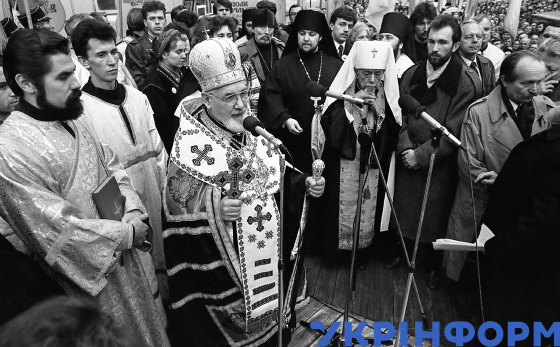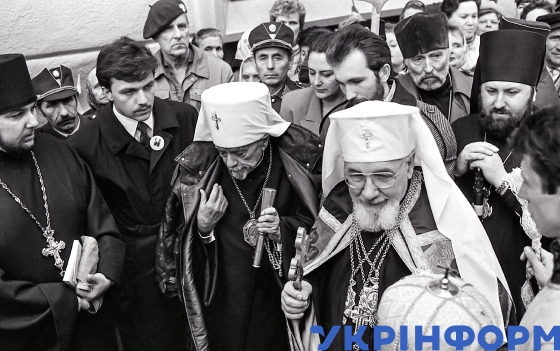 Патріарх Української Автокефальної Православної Церкви (УАПЦ) в Україні Мстислав (Скрипник), який прибув із візитом до України, та митрополит Української греко-католицької церкви Володимир Стернюк (у центрі зліва направо) під час зустрічі з львів’янами, Львів, 27 жовтня 1990 року. Фото Володимира Песляка.