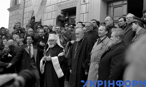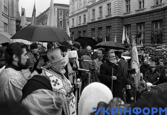 Патріарх Української Автокефальної Православної Церкви (УАПЦ) в Україні Мстислав (Скрипник) (третій праворуч), який прибув із візитом до України, митрополит Української греко-католицької церкви Володимир Стернюк (третій ліворуч) та голова Львівської обласної ради В’ячеслав Чорновіл (праворуч) під час зустрічі з львів’янами, Львів, 27 жовтня 1990 року. Фото Володимира Песляка.