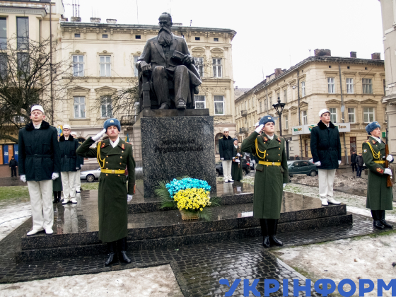 Почесна варта біля пам’ятника Михайлові Грушевському під час урочистостей із нагоди Дня Соборності України, Львів, 22 січня 2009 року. Фото Володимира Песляка та Володимира Телюка.
