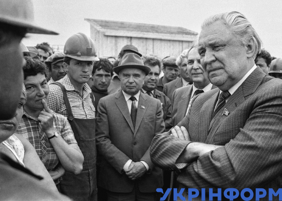 Вище керівництво тоді Радянської України: перший секретар ЦК Компартії України Володимир Щербицький і голова Ради Міністрів України Олександр Ляшко (на першому плані справа наліво) під час зустрічі з персоналом станції та ліквідаторами аварії на ЧАЕС, Чорнобиль, Київщина, липень 1986 року. Фото Володимира Репіка.