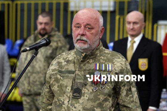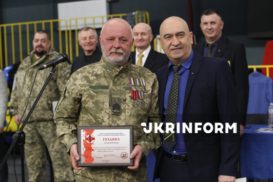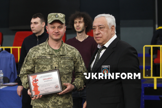 Голова Дніпропетровського обласного об`єднання ветеранів Афганістану Віктор Волошин і головний суддя Атаєв Зокиржон беруть участь в урочистому нагородженні у межах чемпіонату України з кіокушин карате у спортивному комплексі “Олімпійські резерви”, Дніпро, 4 квітня 2026 року. Понад 450 спортсменів із 12 областей України змагалися у розділах “Куміте” та “Ката”. Участь у змаганнях взяли діти від шести років і досвідчені спортсмени.