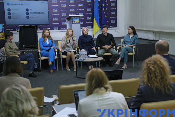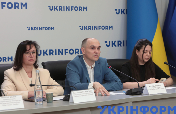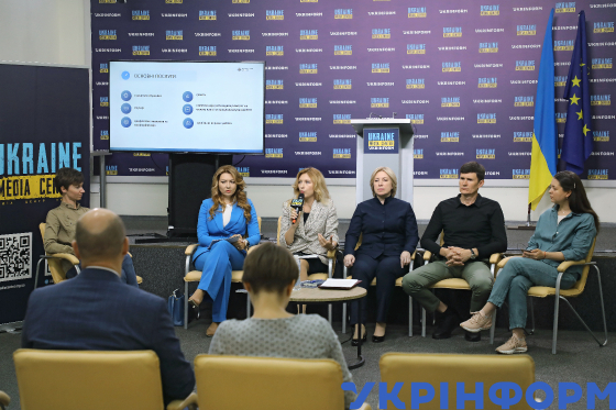 Заступниця міністра розвитку громад та територій України Наталія Козловська, заступник голови представництва KfW в Україні Віталій Шмеріга та виконавча директорка ГО "Громадський холдинг "ГРУПА ВПЛИВУ" Вікторія Золотухіна (зліва направо) під час пресконференції на тему: "Підсумки реалізації програми "Житло для внутрішньо переміщених осіб" в Українському національному інформаційному агентстві "Укрінформ", Київ, 2 липня 2025 року.