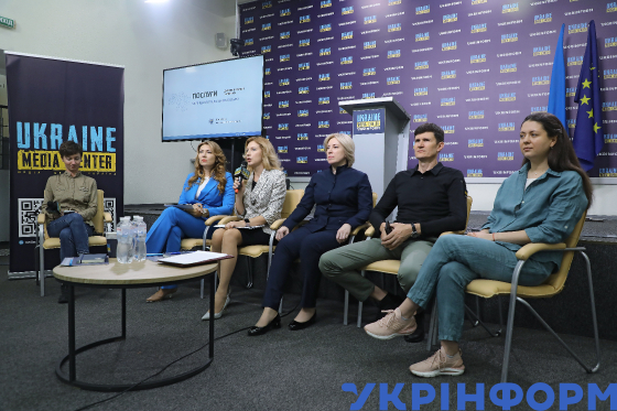 Голова Комітету сталого розвитку Федерації роботодавців України, голова Галузевої ради Федерації металургів України Олена Колеснікова, директорка Державного центру зайнятості Юлія Жовтяк, віцепрем’єр-міністр ‒ міністр з питань реінтеграції тимчасово окупованих територій України Ірина Верещук, заступник голови Закарпатської обласної державної адміністрації Петро Добромільський, виконавча директорка ГО “ГРУПА ВПЛИВУ” Вікторія Золотухіна (зліва направо) під час брифінгу на тему: “Державна підтримка внутрішньо переміщених осіб”, Київ, 29 червня 2023 року.