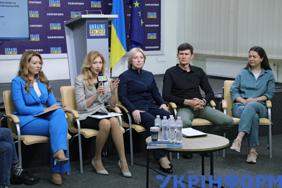 Виконавча директорка ГО "Громадський холдинг "ГРУПА ВПЛИВУ" Вікторія Золотухіна під час пресконференції на тему: "Підсумки реалізації програми "Житло для внутрішньо переміщених осіб" в Українському національному інформаційному агентстві "Укрінформ", Київ, 2 липня 2025 року.