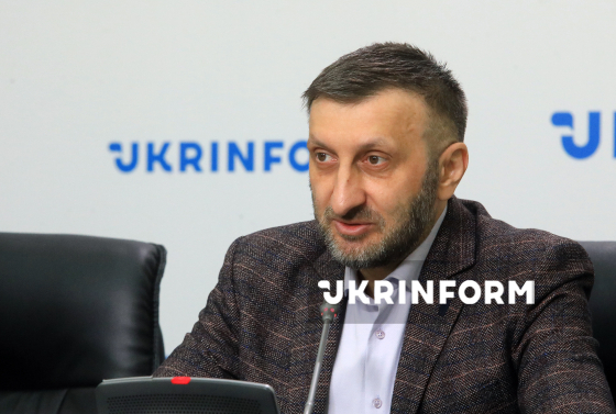 Завідувач Лабораторії протидії дезінформації КНЕУ Віталій Кулик бере участь у пресконференції на тему: “Як наблизити кінець конфлікту в Придністровському регіоні Республіки Молдова?”, Київ, 3 березня 2026 року.