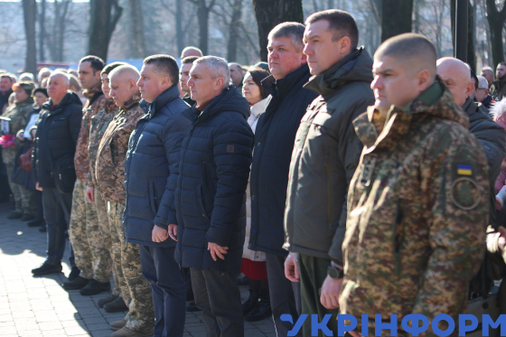 Заступник міського голови Івано-Франківська Віталій Федорів, начальник відділу в справах ветеранів України в Івано-Франківській області Володимир Веркалець та заступник начальника Івано-Франківської ОВА Віталій Ільчишин (у центрі справа наліво) під час віча пам’яті з нагоди Дня вшанування учасників бойових дій на території інших держав та 35-ї річниці виведення військ з Республіки Афганістан, Івано-Франківськ, 15 лютого 2024 року.